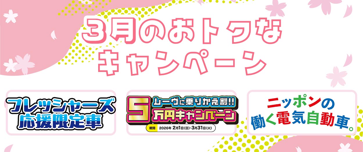 人気車種の限定特別車や、今だけのキャッシュバックキャンペーンなど、見逃せない内容となっています。